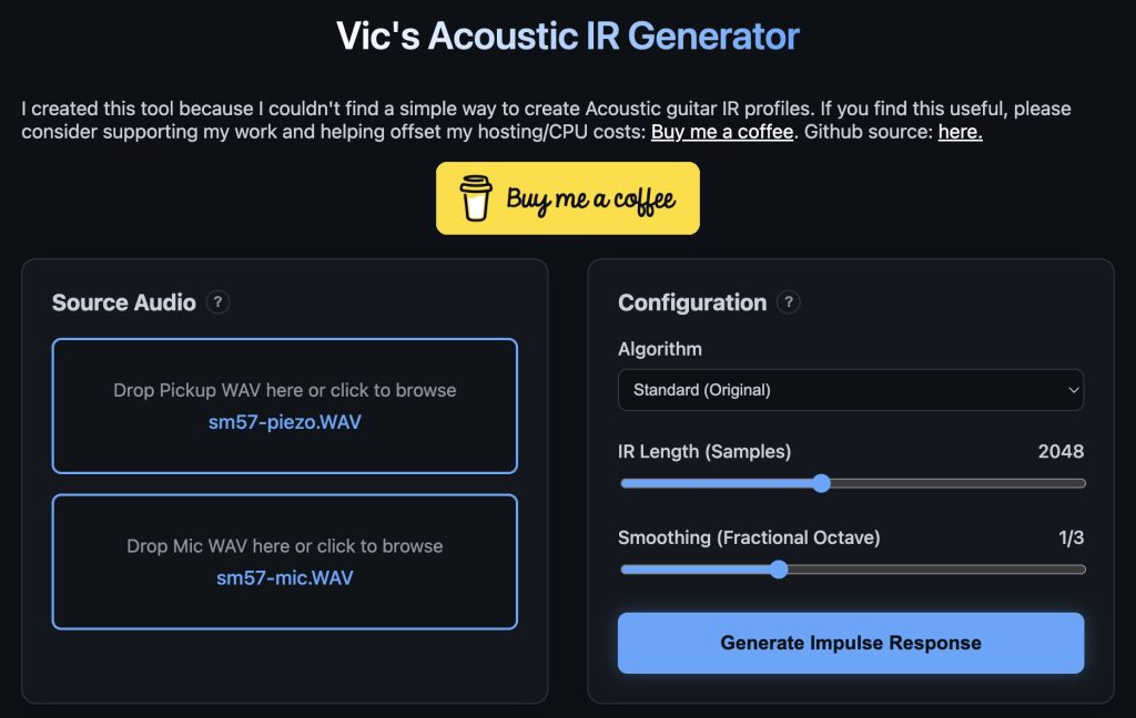 Visit this website: Vic’s IR Generator. Note that this site is hosted on a free tier on Render, so might take a bit to load for the first time (50 seconds or so). Once loaded, it looks like this. Drag and drop your two source wav files into the “Source Audio” section like so: