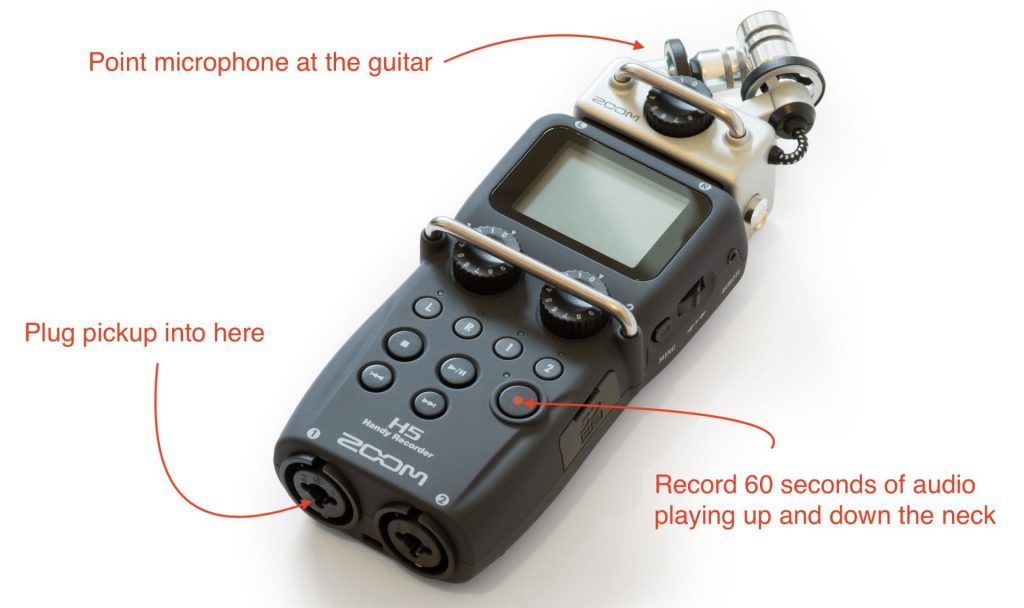 I recommend recording 60 seconds of playing up and down the neck to capture the full range of your instrument: chords, harmonics, single note scales.